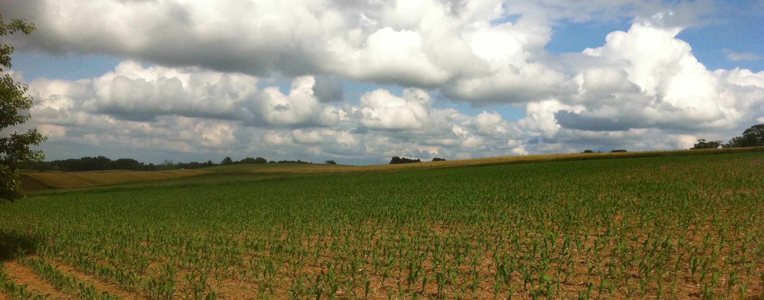 This  is one of my favorite views of the world. It is part of my daily walk with the dog and is one of the farmers’ fields near my house. I love to see it change from day to day, from season to seasons, from year to year. The tree to the left (almost off frame) is big creaking old thing with branches that hang down to form a natural arbor. It is about mid way in our little walk and Honey, the dog, likes to hang out there under the cool welcoming leaves for a few minutes before we race off for the second half of our trek. No one  (human) is ever around out in these fields — don’t worry I always take my cell phone incase I fall and can’t get up — so this is the ideal place to work out lines of pesky dialog that have been pinballing around my brain. Or it’s just a great place to meditate or pray. 14 Steps to each Hail Mary. 15 Steps to each Our Father. Not that I’m counting. One day I’ll know they’ll grow mini mansions here, not corn, and that will break my heart. But for now I’m rejoicing that I live in such a wonderful world.
