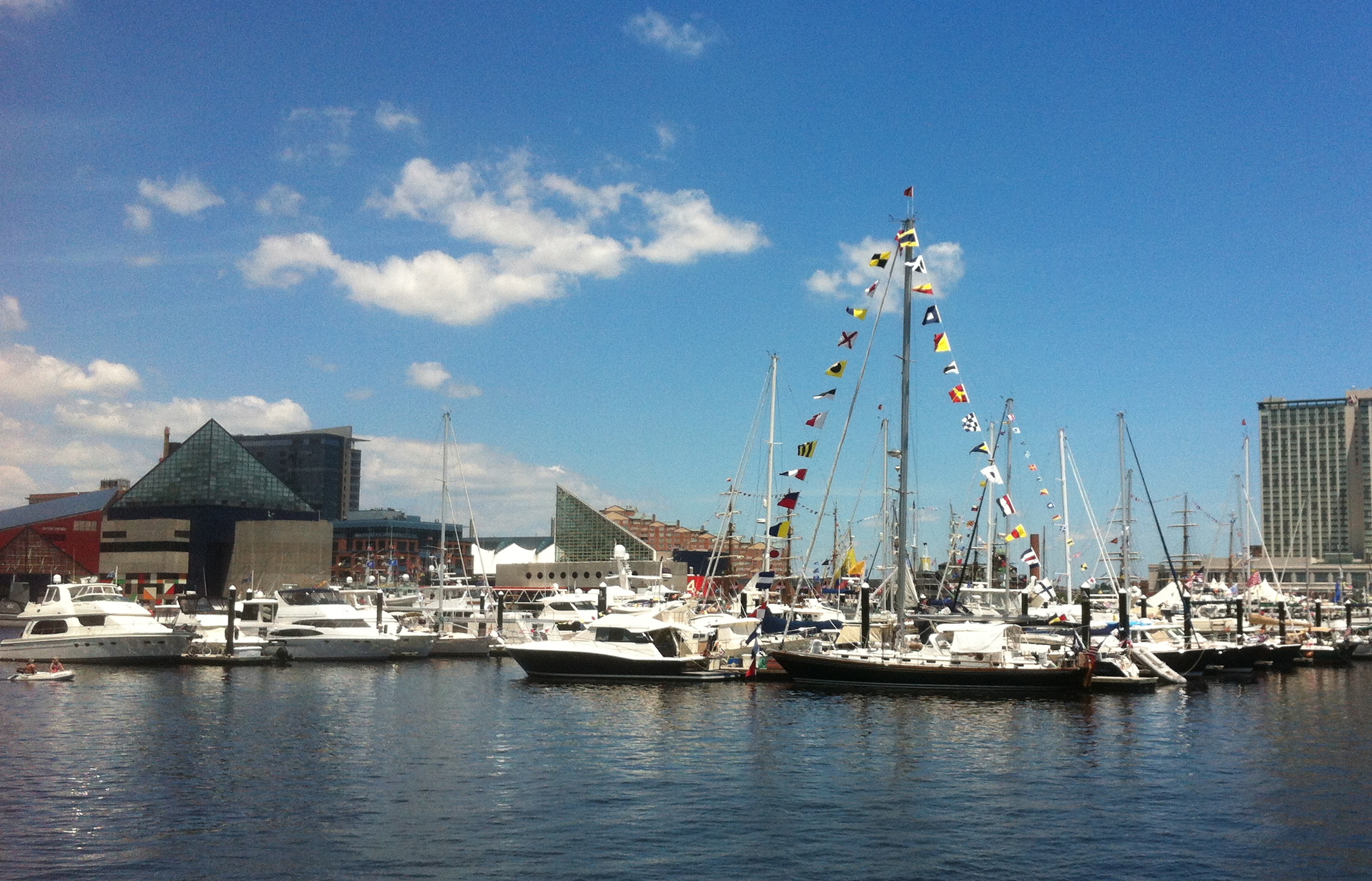 Looking at some of the smaller ships at the the marina near Rash Field. The Baltimore Aquarium is the background.