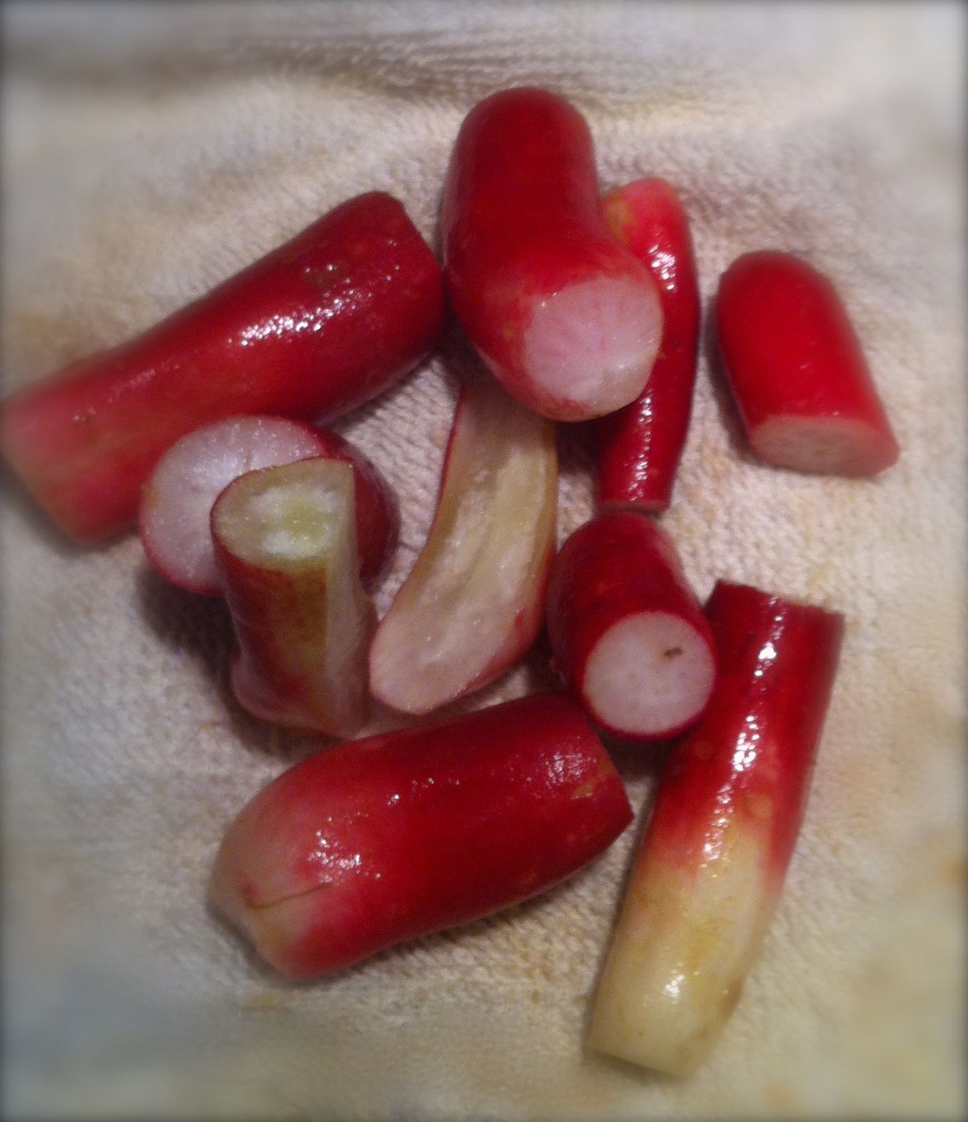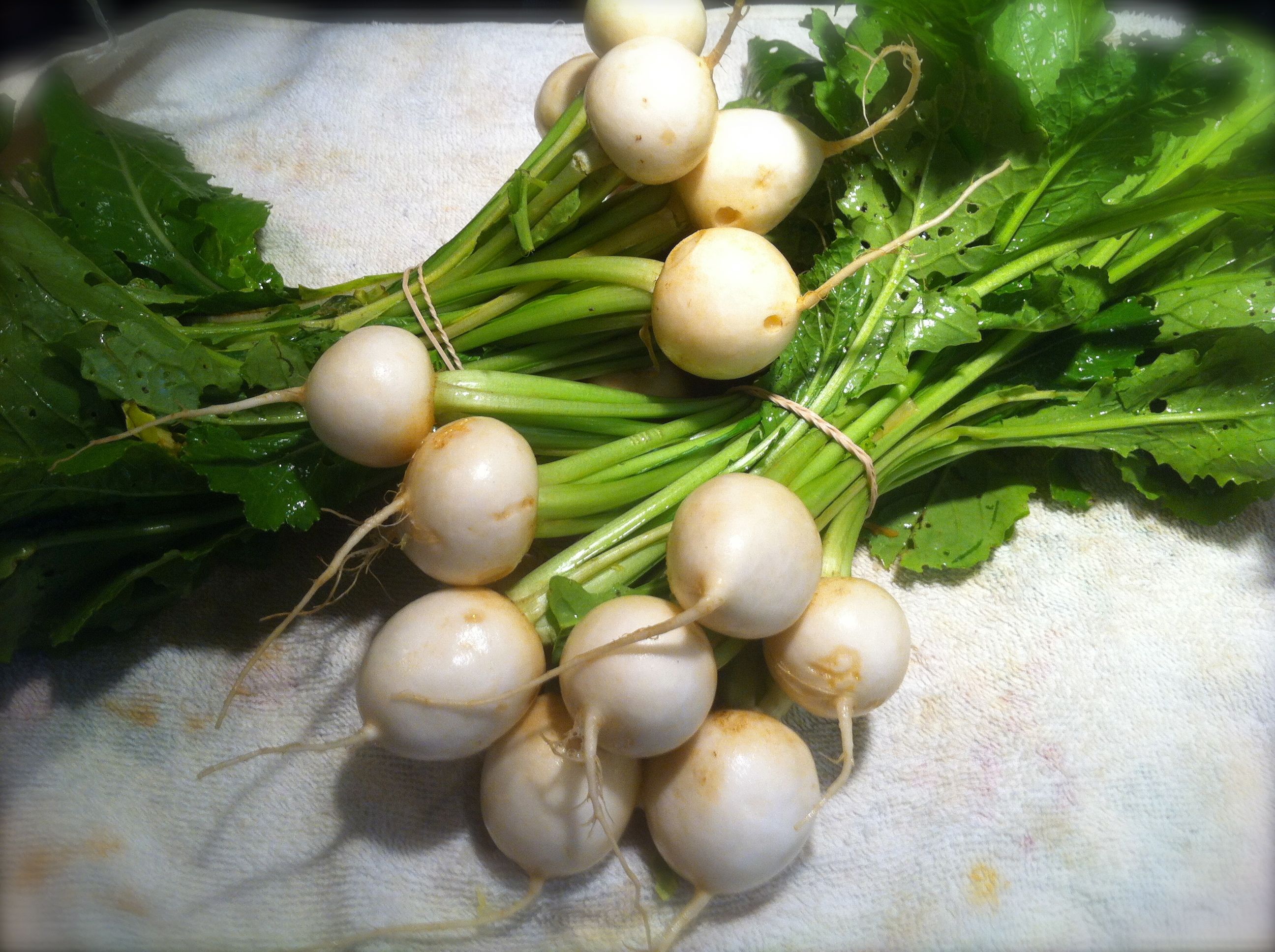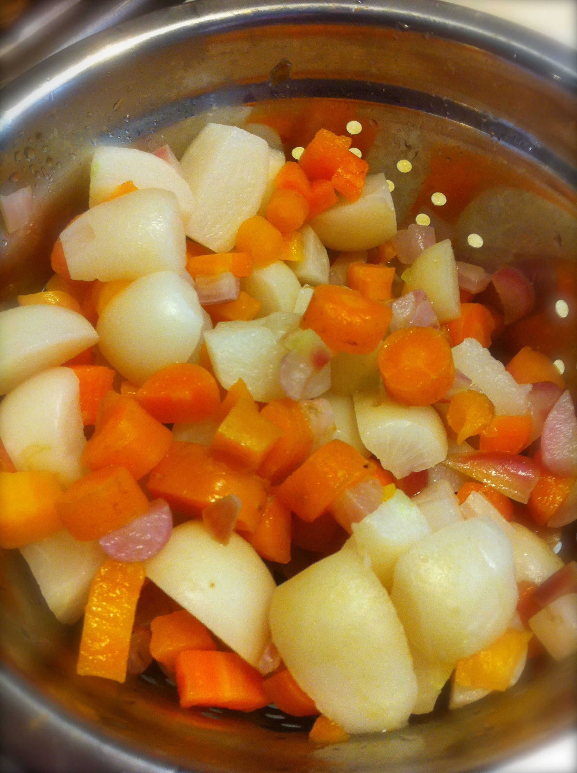 2. Remove the greens from the turnips and radishes and cut into 1/2″ pieces. Scrape the carrots, cut off the tops and ends and cut into 1/4″ chunks. Put the turnips, radish and carrots into a large pot with salted water and boil until tender. About 10 minutes. Drain and run veggies under cold water to stop them from cooking further.