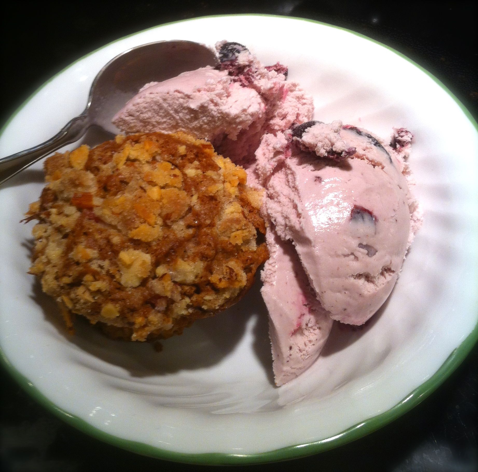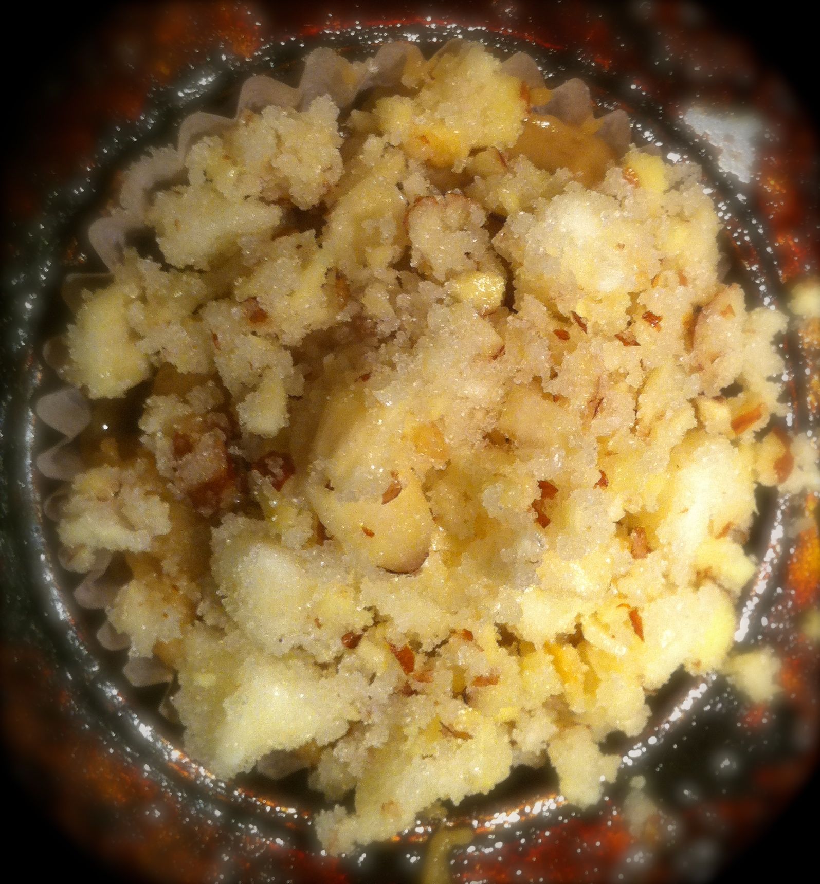 7. Divide the batter evenly amongst the muffin cups. (This recipe made 12 large muffins.) Set aside and make the Topping.
