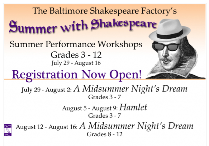 The Baltimore Shakespeare Factory is offering three, one week long workshops that will allow kids to experience what it might be like to travel back in time to the 1600s and be a part of the fun and excitement of Shakespeare’s acting company–The King’s Men. The BSF’s  “Summer with Shakespeare:Performance Workshops” will help students develop acting skills, make friends, build confidence, and develop an appreciation and understanding of Shakespeare’s work.