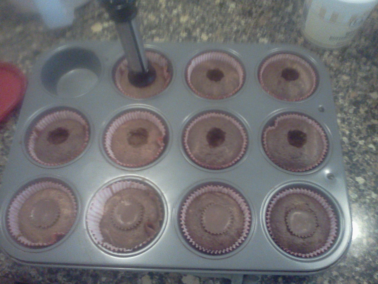 6. Using an APPLE CORER punch a hole about 1/2″ deep in the middle of each cupcake. Drop a mini Reese’s Peanut Butter Cup into the hole. The Chocolate of the Reese’s will melt into the cupcake.