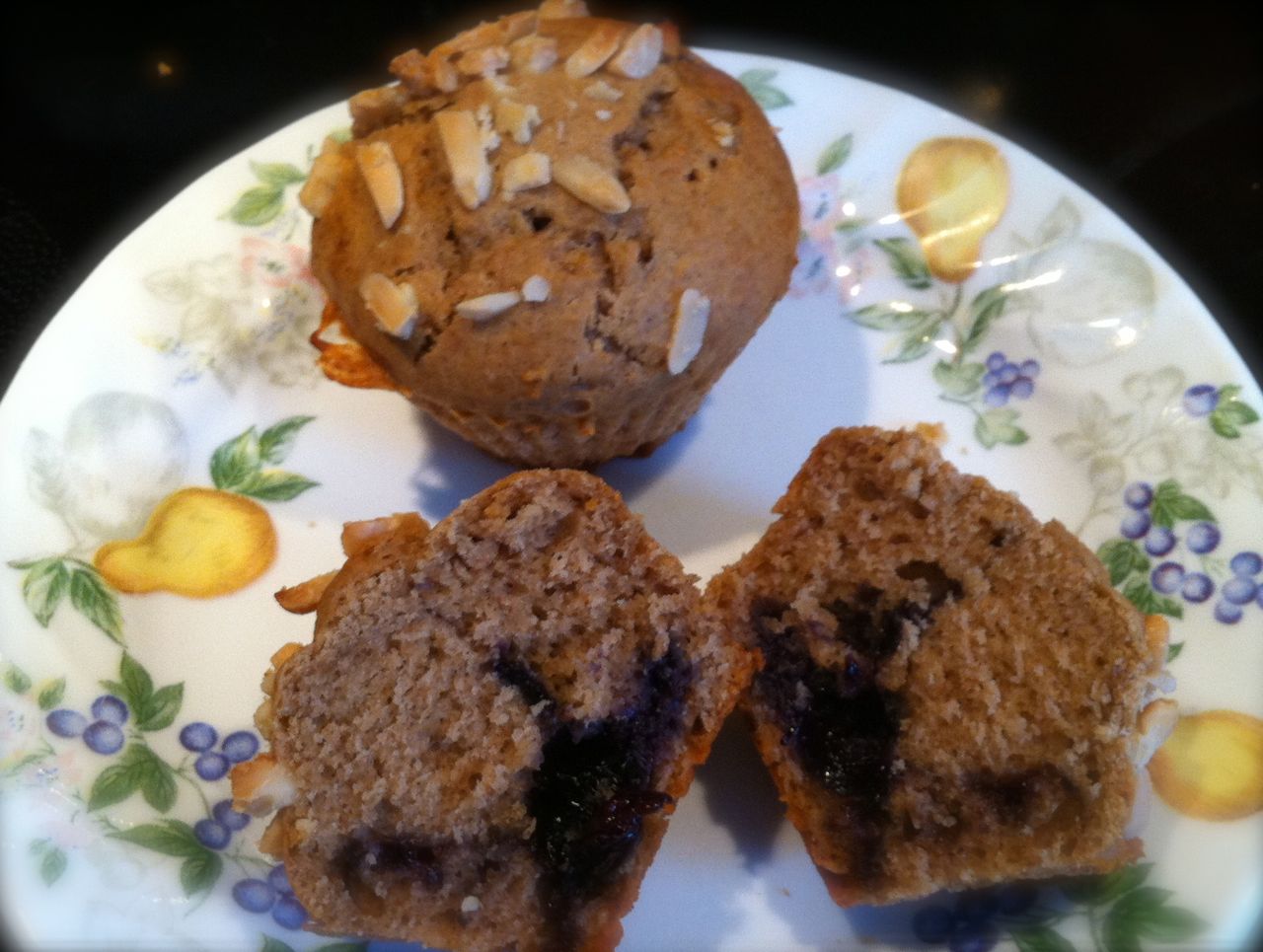 Yesterday I spent way too much time on the Mozart bioBlog so I didn’t have time to make any muffins… thus I bring unto you… MUFFIN TUESDAY! Today I have for you PB&J&B (Peanut Butter, Jelly and Blueberry) Muffins. I’ve done a double batch so I could send a few off to college kiddos, but you can just as easily halve this and make a single batch.