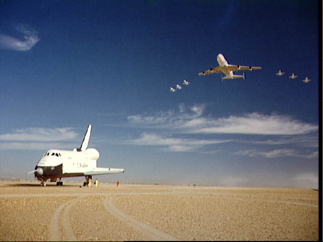 View of NASA 747 and T-38s flying over Shuttle Orbiter 101 “Enterprise” just after Haise and C. Gordon Fullerton landed the Shuttle on September 23, 1977. [Image courtesy NASA]