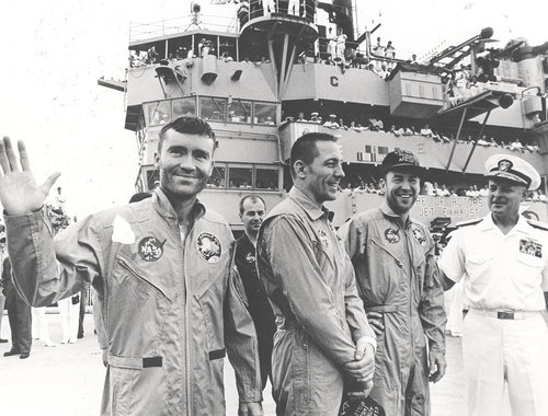 Apollo 13 crew aboard the USS Iwo Jima after splash in the Pacific. They are (l-r) Fred Haise, John Swigert and James Lovell. [Image courtesy: about.com]